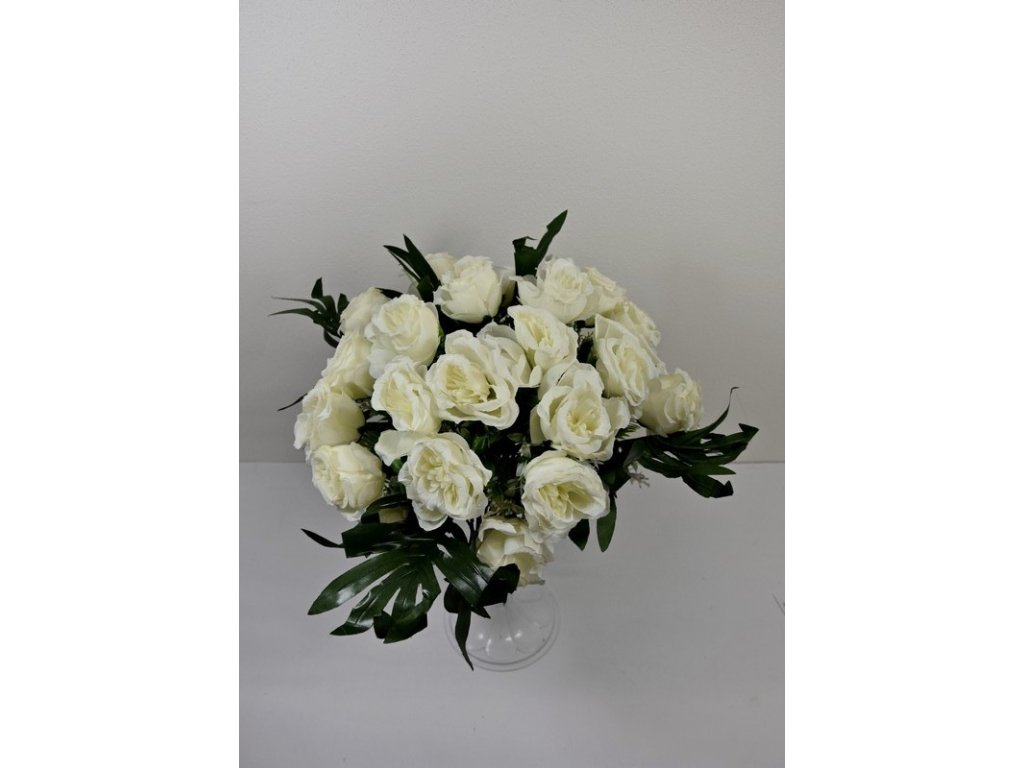 Kytica z umelých kvetov ruží kde kvet má šírku cca 5cm. V kytici je 24kvetov a mix listov.