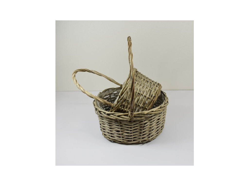 Košík s prútia o počte dvoch kusov s celkovou výškou väčšieho košíka s rúčkou je 39,5cm a spodok koša je vysoký 12,5cm. Je vystlaný igelitom, takže je vhodný aj na mokré aranžovanie, na čerstvé rezané kvety alebo poslúži aj na darčekové balenie.Dodatočné parametre