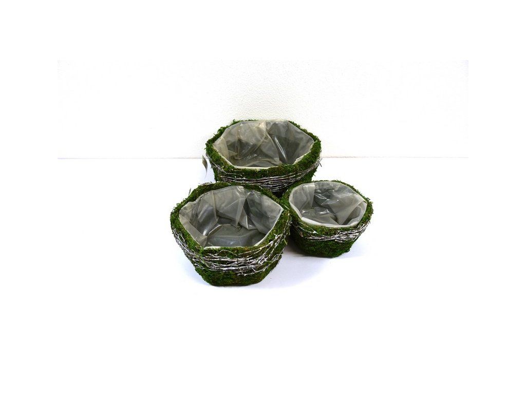 Miska je vyrobená z machu a bieleho prútia po obvode na kovovom základe. Do vnútra tejto misky je vložený igelit, čím je vhodná aj na mokré aranžovanie, prípadne výsadbu plytko koreniacich rastlín alebo cibuľovín. Miska je hlbšia ako ostatné misky, pozrite rozmery.
